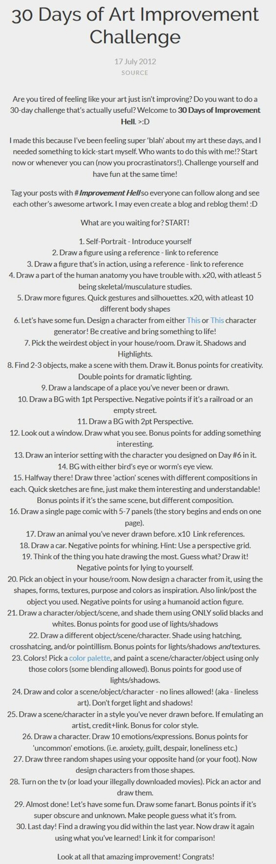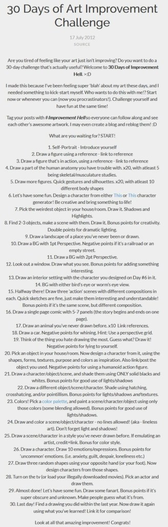 As a form of structured self improvement, I’ve decided to take on a drawing challenge that I found online. It’s a list of specific tasks to complete for 30 days (though I’m not following the calendar so that I won’t quit) that are designed to help improve one’s art skills, in an intense gauntlet of art challenges. I’m excited to start this project, and to see how much I can improve my art!