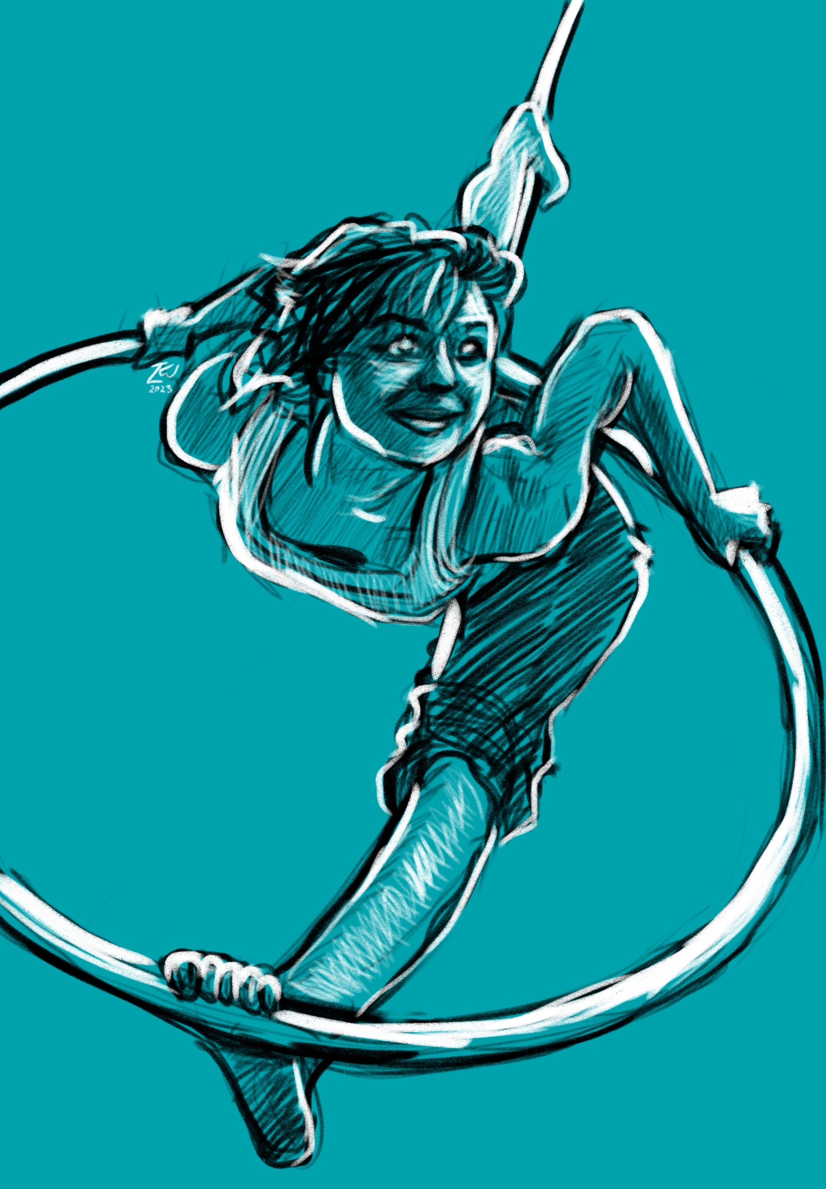 For the one with the hoop, I stuck with my sketching pencil for the whole thing, which I think gave it more energy. I really liked this reference image, because it has a lot of energy but also foreshortening. It’s also just a fun composition with the hoop.