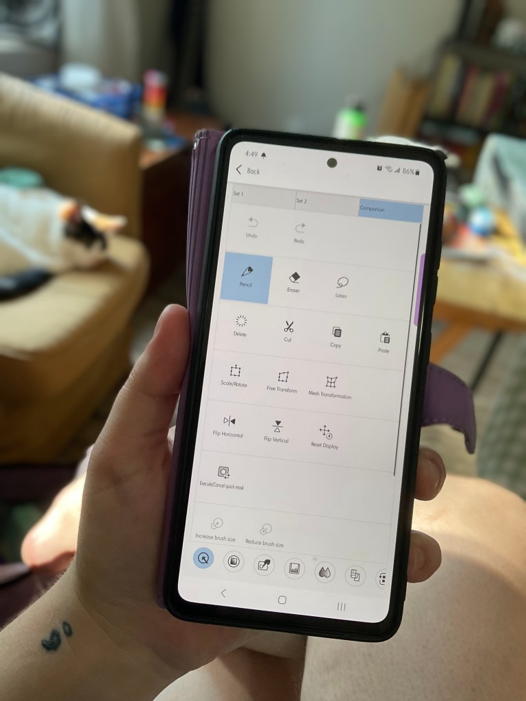 I can change the tool I’m drawing with, I can access my palette, I can zoom in or out, I can flip the canvas, and all sorts of other things! All from my phone’s screen!