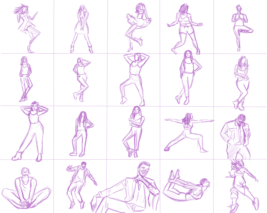 But then tonight, I realized that Clip Studio provided me with an opportunity for a fresh start! I made a grid this time, so I had guidelines to follow, and I churned out 20 poses in one sitting! I don’t know if it was the break, or the change in software, but it went much smoother this time.