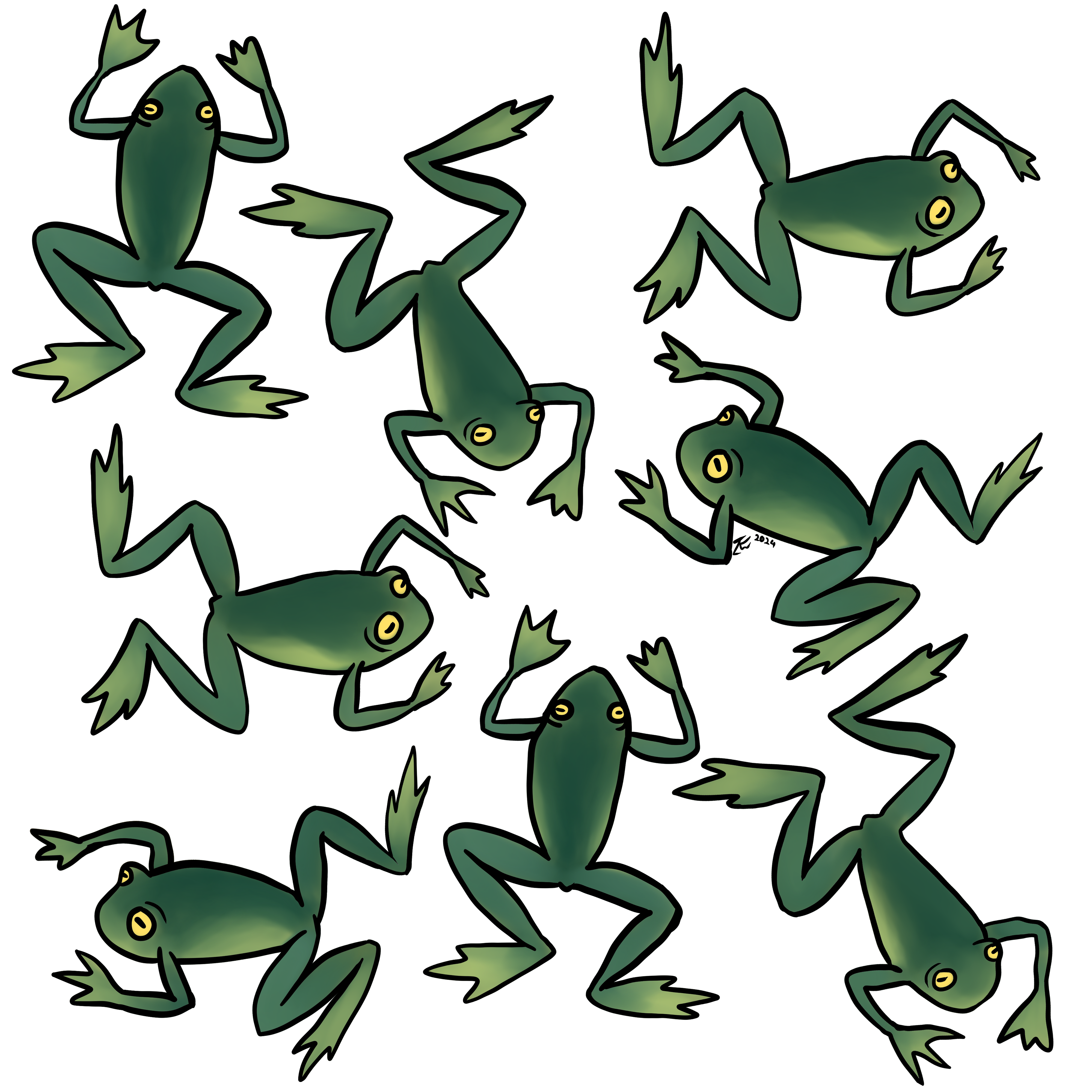 The waterfall, skulls, and frogs were drawn as transparent illustrations so I could upload them as designs on RedBubble (check out my shop here!) The transparency helps make them work on the products better. As to why they’re a floating waterfall, a field of frogs, and a collection of skulls, that’s just because I thought they were cool concepts and I wanted them to be on clothes and notebooks and things.