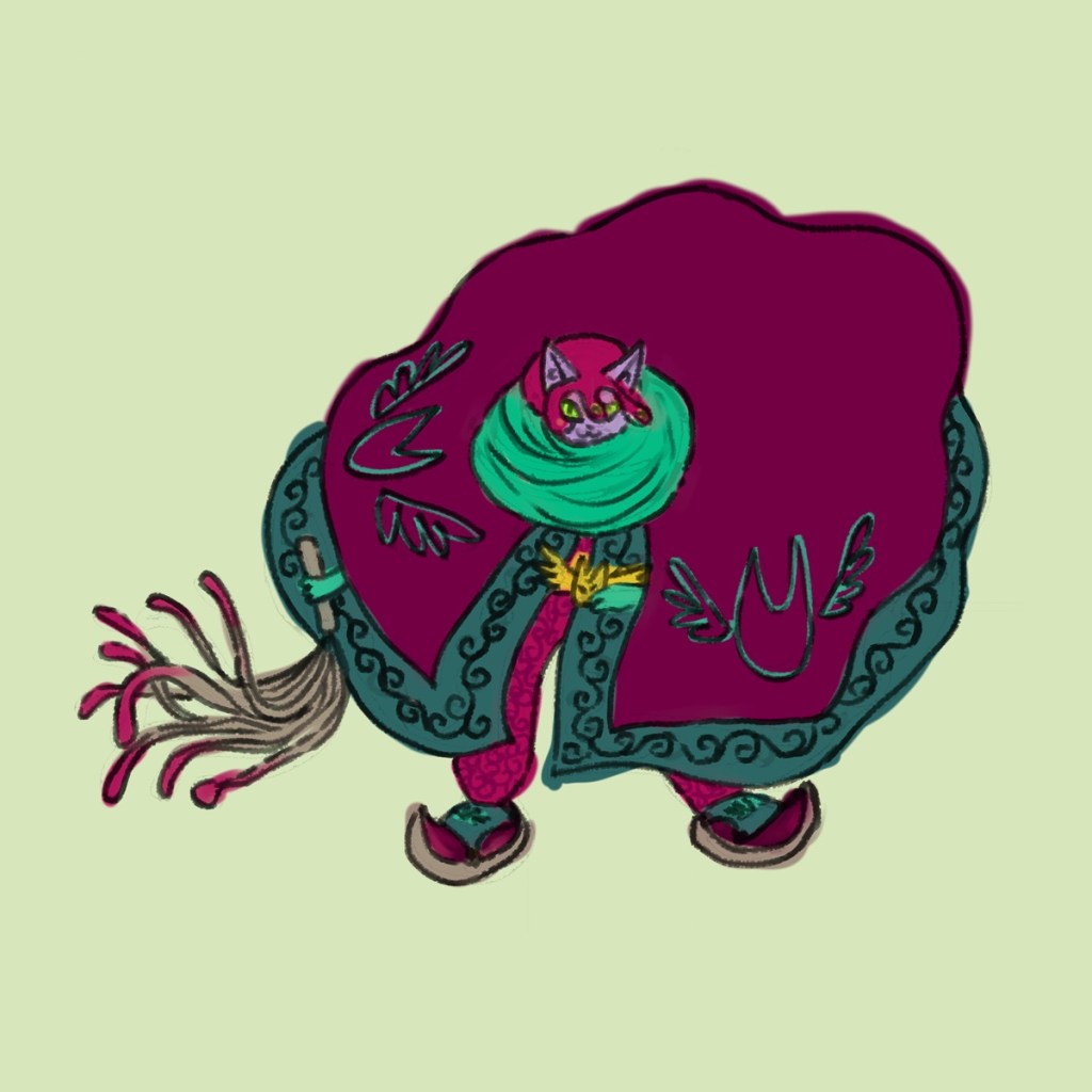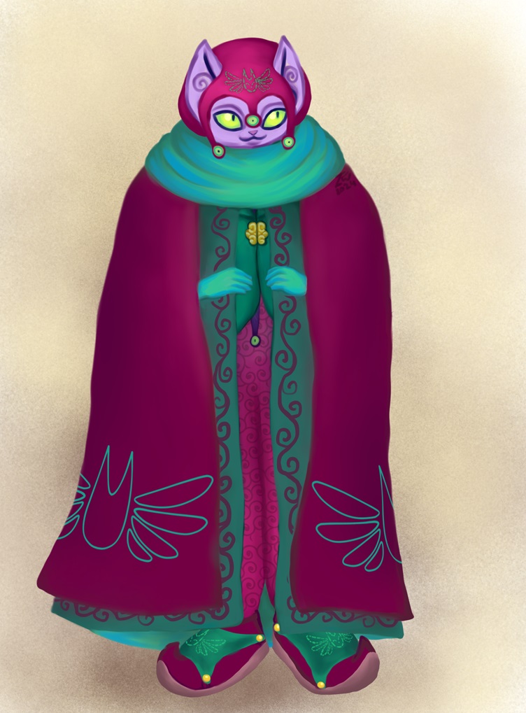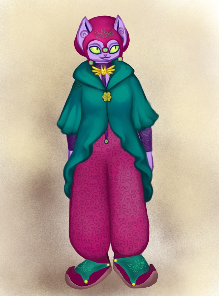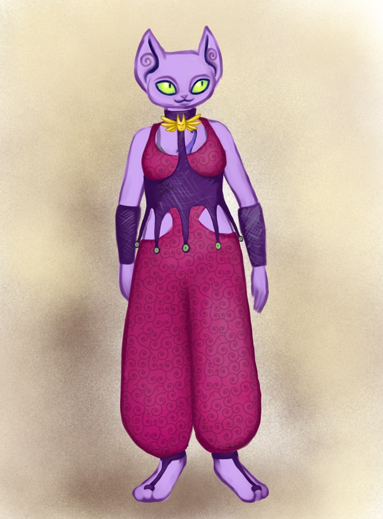 Descriptive Keywords: feline, furless, green eyes, lavender skin, peach fuzz, curled ears, black eyeliner, red jumpsuit, decorative leather armour, heavy fabric layers, with pockets, gold holy symbol, pointy boots, warm cloak, decorative hat, cat-o-nine-tails weapon
