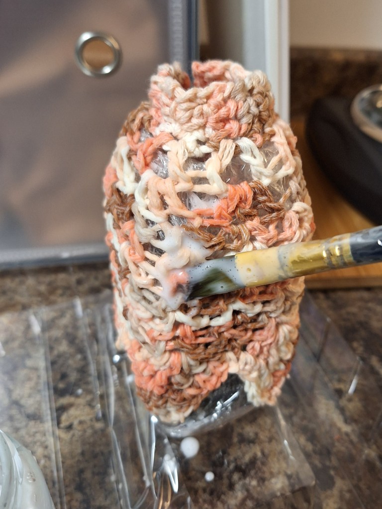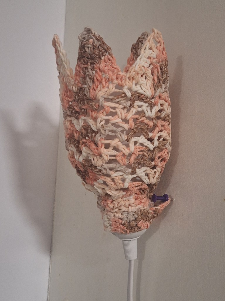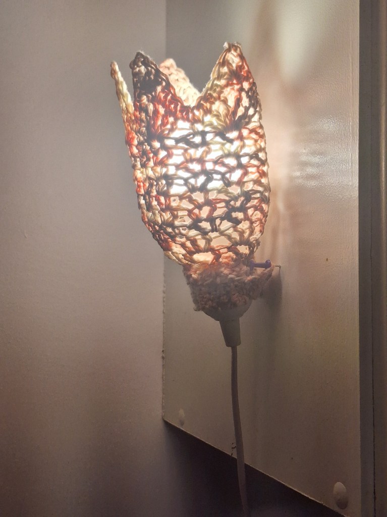 Then I wanted a light over the sink for while I’m washing dishes. I have several lamps that are just a light bulb socket on a cord, so I made a little sling to hang one up by. The light was harsh with just an exposed bulb, so I wanted a lampshade. I crocheted one and to stiffen it, I put it on an old bottle covered in plastic wrap and then coated it in a water-glue mixture. I let it dry overnight and behold, a finished lampshade!