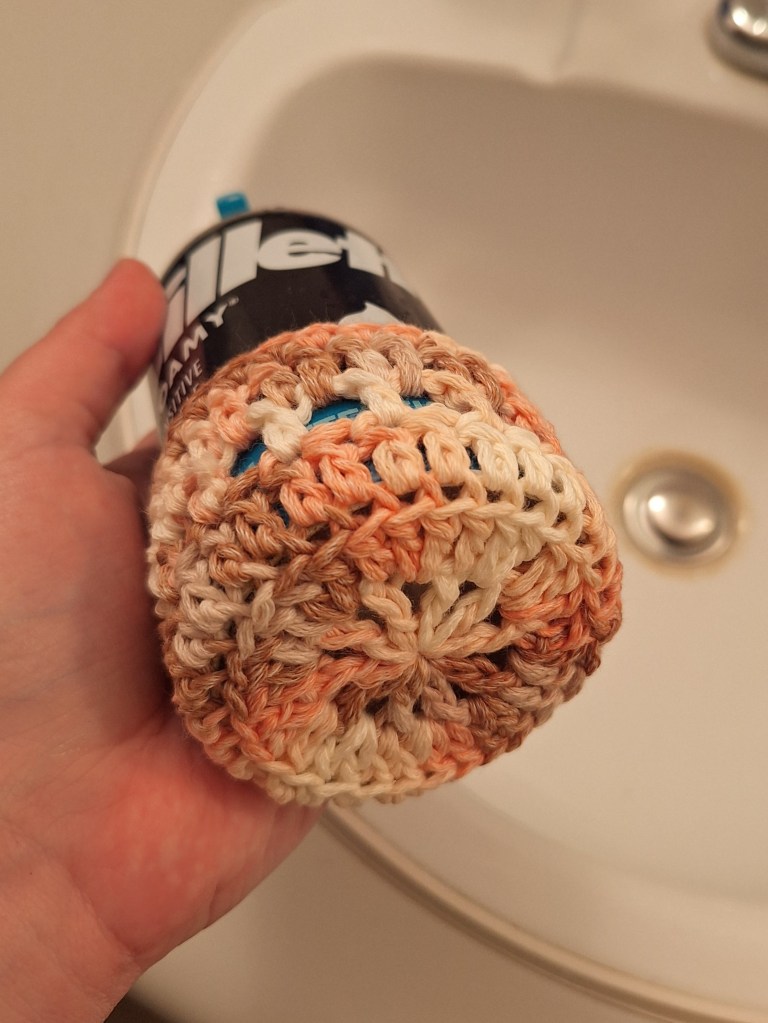 For starters, I don’t like that the bottom metal of the shaving cream can can leave marks on the counter, so I crocheted a little cozy for it. Functional, and it looks pretty!