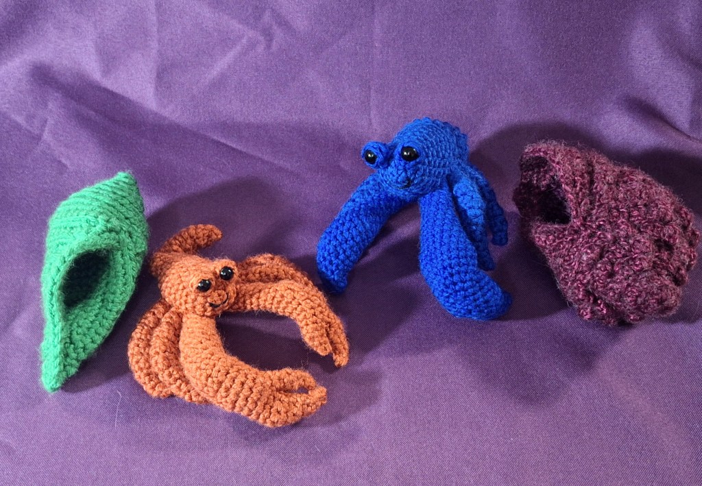 Next, I decided to tackle the complexity that is a hermit crab! The crabs themselves were a challenge, what with the claws and then trying to figure out the pleon (the body that curls into the shell), but the real challenge was figuring out how to crochet a shell! It took a few attempts before I figured it out, but I’m pretty happy with the results I achieved.