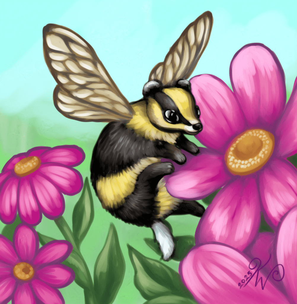 The creatures I was combining were a badger and a bee, creating a honey badger! I used references of a European badger for the iconic striped face, and a bumble bee for the wings and fluffy stripes.